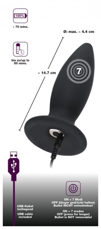 Пробка имеет 7 различных режимов вибрации, при помощи которых, Вы испытаете совершенно новые анальные ощущения и максимально расслабите анальную зону перед половым актом! Мощная вибрация проникает в каждую клеточку и идеально отвлекает от дискомфорта