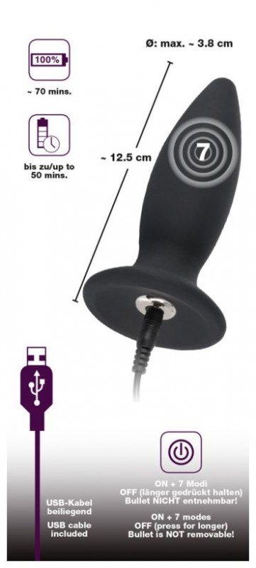 Пробка имеет 7 различных режимов вибрации, при помощи которых, Вы испытаете совершенно новые анальные ощущения и максимально расслабите анальную зону перед половым актом! Мощная вибрация проникает в каждую клеточку и идеально отвлекает от дискомфорта