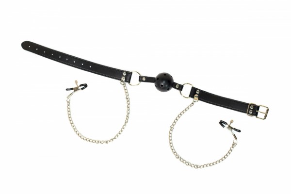 Потрясающий девайс для максимально экстремальных игр в стиле БДСМ, - дышащий кляп с зажимами на соски "Party Hard"!