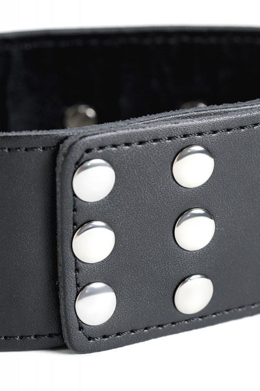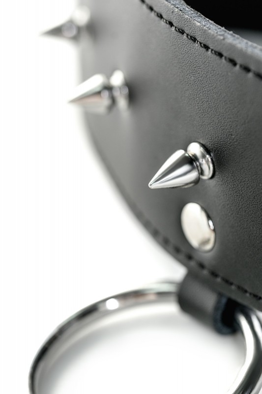 Выполнен из натуральной кожи в черном цвете и декорирован рядом металлических острых шипов. Большое кольцо на ошейнике позволяет крепить различные девайсы, либо поводок!