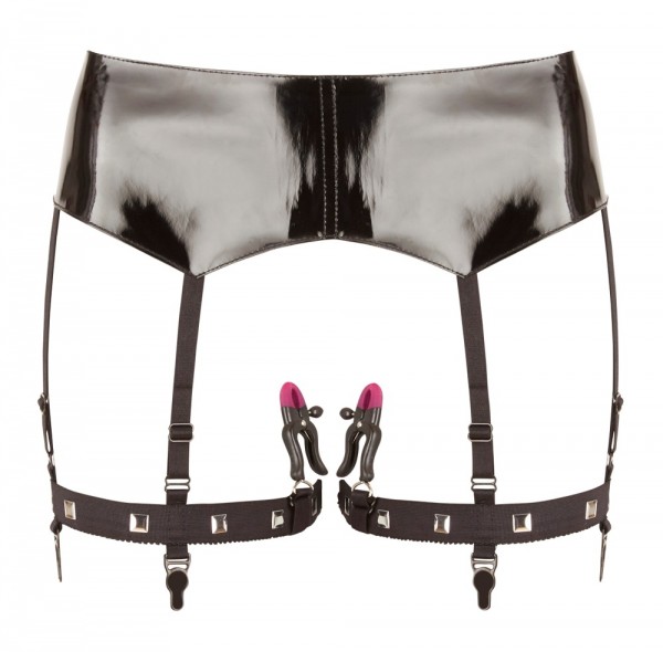 Прелесть пояса заключается не только в том, что он выполнен из настоящего винила, но и в том, что к нему прикреплены подвязки для чулок с пажами, а также зажимы для половых губ!